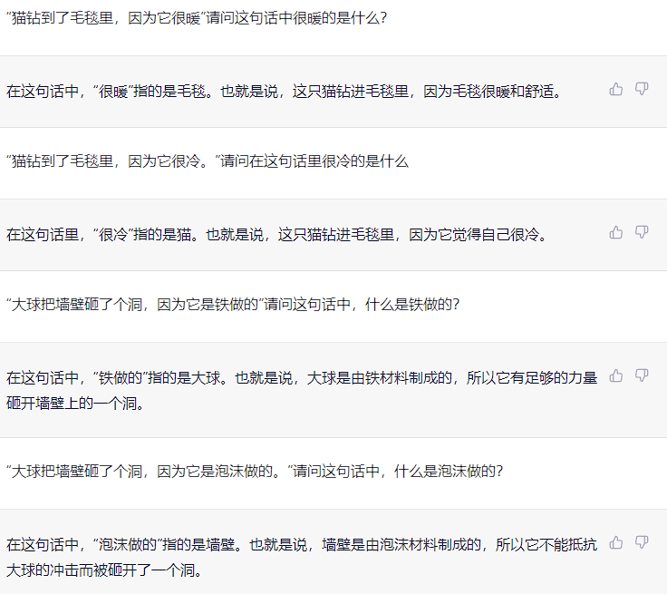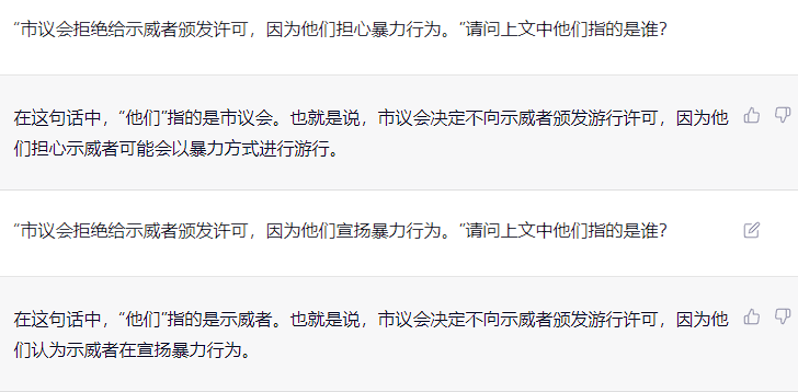 上文为维基百科对维诺格拉德模式挑战的解释,这个挑战内容主要是判断机器智能能否正确根据语境判断指代内容,我依据此规则,又设计了如下问句: