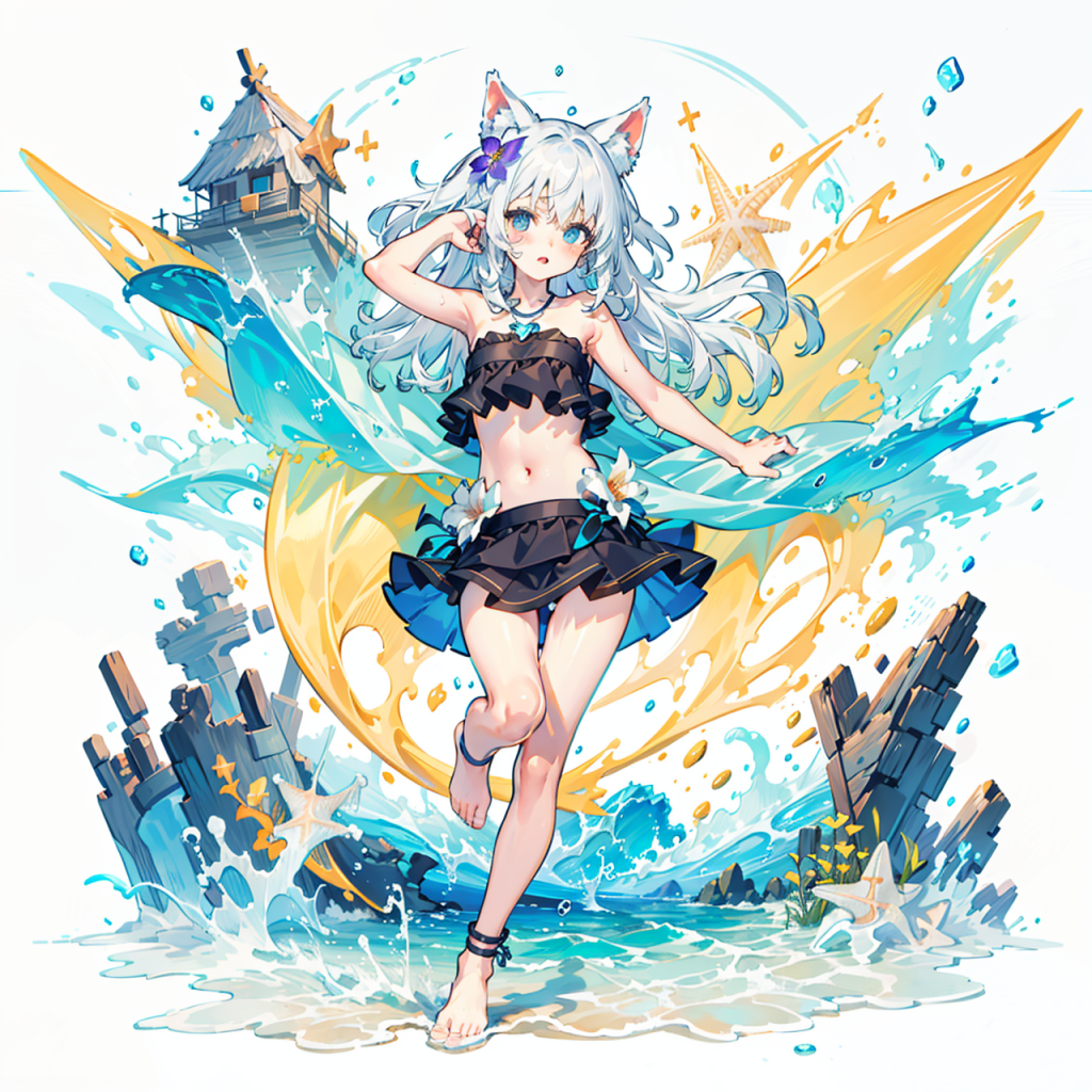 (1 girl), (solo), (full body:1.3), look at viewer, (hairflower:1.2), loli,animal ears, blue eyes, hair ornament, wet, cute face, (long hair:1.3), (white hair:1.2), star in eye, small chest,(strapless:1.4), (tankini:1.5), necklace, (bare legs:1.2), , nsfw, (lowleg mini skirt:1.3), (bare foot:1.2),single ankle strap, (jumping :1.1), (standing on one leg, :1.2),(hand up:1.2), (lowleg:1.2), (pubic hair peek:1.3),